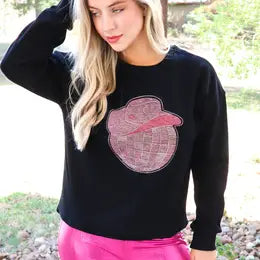 Disco Rodeo with MK! This black sweatshirt is lightly fleeced on the inside and what we think is the perfect length. Front features distressed ivory and tonal pink disco ball and cowboy hat trimmed with sparkling pink crystals. Fall, Winter, early Spring... don't be a homebody, Disco Rodeo with your fine self!