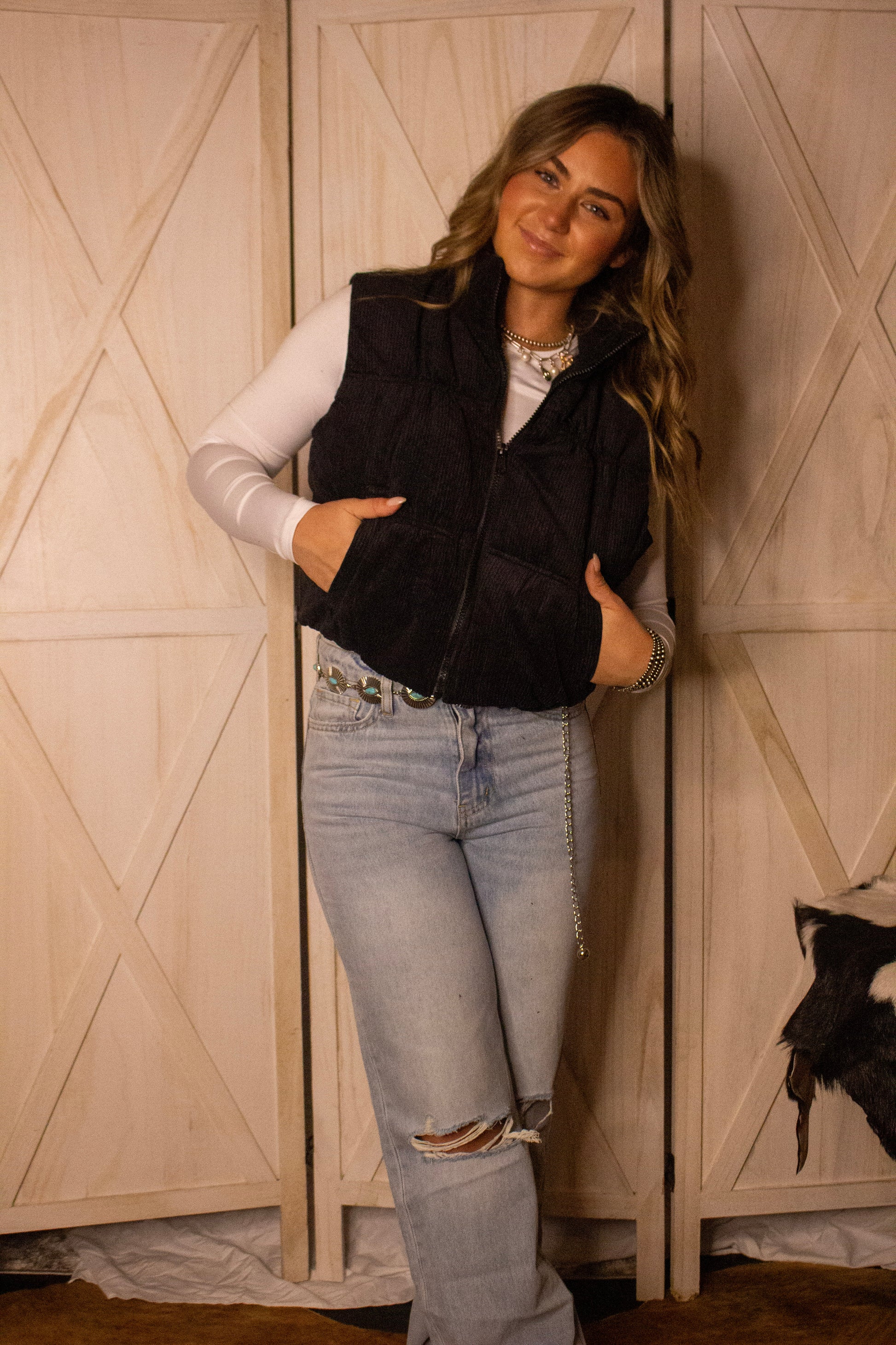 Talk about a versatile piece! This is such a cute vest! Size up for a longer fit. Pair it with a bodysuit, long sleeve top, or your favorite crewneck/hoodie!
